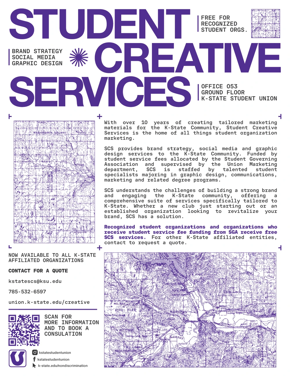 I currently serve as the Student Lead for Student Creative Services at Kansas State University where I oversee projects, produce graphics, and manage client relations while in my final year of classes.